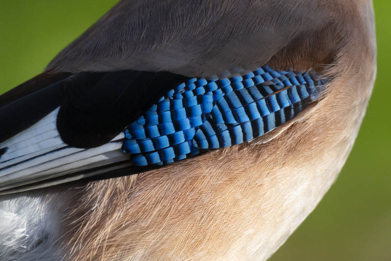 Al van kinds af aan, toen de Gaai nog de Vlaamse Gaai heette, fascineerde mij het stukje blauw bij de Gaai. Dat stukje blauw is prachtig op de vleugels, bijna niet passend bij een Europese vogel. Vanuit de bos-vogelhut(ten) komen gaaien vaak dichtbij en zijn ze heel mooi te fotograferen en met de 800 mm en met wat extra digitale zoom stond dat stukje er dan eindelijk in detail op:). Van dichtbij zijn het dan bijzondere losse veertjes met blokjes zwart en blauw.