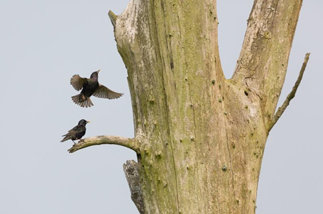 In de Oostvaardersplassen staan er veel dode bomen. In het openbare gebied zijn zij bepalend liggend en staand voor het zicht van het landschap. Voor spreeuwen ideale plekken om een jongen in groot te brengen. De eerste jonge spreeuwen zijn al uitgevlogen en zie je o.a. op de dijk Enkhuizen-Lelystad met velen al weer langs de weg en op de vangrail-sen. In een zwerm een prachtig gezicht.