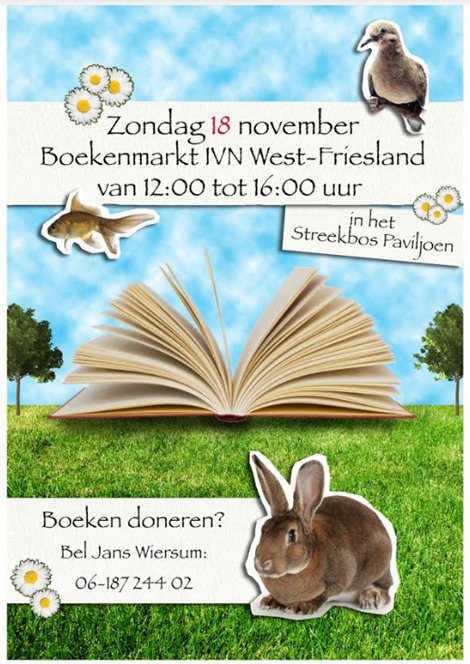 Zondagmiddag 18 november houdt IVN West-Friesland weer van 12.00 – 16.00 uur een tweedehands boekenmarkt in de ontvangstruimte van het Streekbos Paviljoen. Boekenliefhebbers kunnen koopjes opdoen voor de Sint of als leesvoer voor de kerstvakantie. Een uitgebreid assortiment met recente toppers voor groot en klein is voorradig. De opbrengst wordt besteed aan bijzondere projecten bij het IVN West-Friesland.