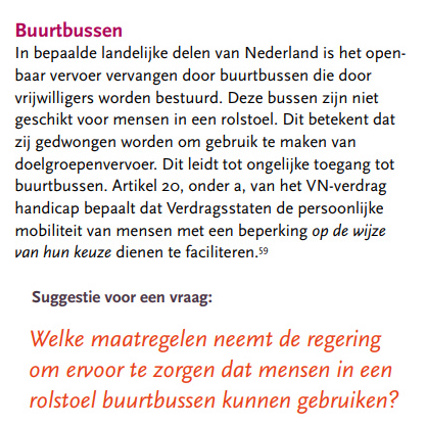 In bepaalde landelijke delen van Nederland is het openbaar vervoer vervangen door buurtbussen die door vrijwilligers worden bestuurd. Deze bussen zijn niet geschikt voor mensen in een rolstoel. Dit betekent dat zij gedwongen worden om gebruik te maken van doelgroepenvervoer. Dit leidt tot ongelijke toegang tot buurtbussen. Artikel 20, onder a, van het VN-verdrag handicap bepaalt dat Verdragsstaten de persoonlijke mobiliteit van mensen met een beperking op de wijze van hun keuze dienen te faciliteren.