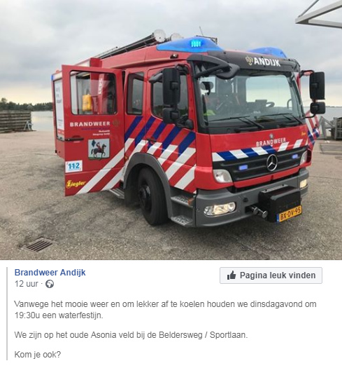 De brandweer van Andijk gaat voor de nodige verkoeling zorgen, zo valt er te lezen op de Facebookpagina van de brandweer van Andijk. Dinsdagavond, om 19:30 uur plaatselijke tijd, zal een bluswagen van de brandweer op het oude Asoniaterrein een heus waterfestijn houden!