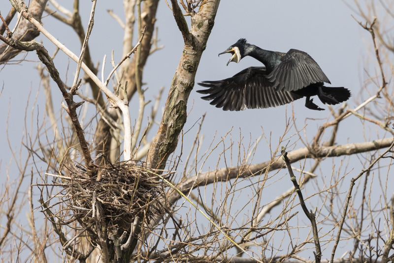 Al volop broedtijd bij veel vogels, zoals bij de aalscholvers en blauwe reigers. De aalscholver vlak voor de landing bij een kleine kolonie langs een grasstrook in de duinen bij de Kennemerduinen.500mm, f5,6, 1/2000, Iso 400