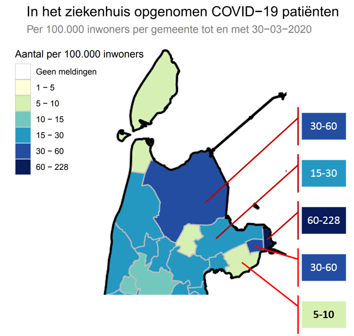 De kaart geeft het aantal COVID19-patiënten dat opgenomen is een ziekenhuis. Het zijn aantallen omgerekend naar het aantal per 100.000 inwoners. Dat wordt gedaan om vergelijkingen te kunnen maken.