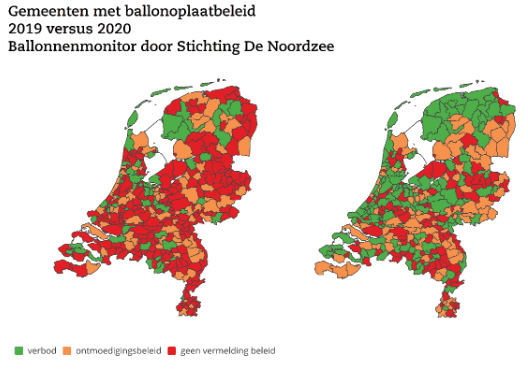 | 41% heeft een verbod Een jaar geleden had 17% van de gemeenten een verbod op ballonoplatingen, nu is dat 41%. Dat zijn 145 gemeenten. In 2018 had nog maar 5% een verbod ingesteld. Sinds de verantwoordelijkheid voor ballonoplaatbeleid in 2014 bij de gemeenten werd gelegd, monitort Stichting De Noordzee de stand van zaken per gemeente. De afgelopen twee jaar ziet de stichting de cijfers sterk stijgen. Minstens twaalf gemeenten buigen zich op dit moment over een verbod en zullen dat naar verwacht komende maanden vastleggen in de Algemene Plaatselijke Verordening. Provincies Percentage gemeenten met een verbod (aantal) Friesland 78% (14) Noord-Holland 60% (28) Groningen 58% (7) Zeeland 54% (7) Zuid-Holland 54% (28) Drenthe 42% (5) Noord-Brabant 34% (21) Flevoland 33% (2) Utrecht 31% (8) Gelderland 29% (15) Overijssel 24% (6) Limburg13% (4) Kustprovincies zijn koploper Er is een duidelijk verschil tussen de stand van zaken in de verschillende gemeentes. Alle provincies die aan de Noordzeekust grenzen doen het beter dan het landelijk gemiddelde. Friesland staat bovenaan met 78%. In Noord-Holland heeft 60% van de gemeenten een verbod, in Groningen 58% en ook in Zeeland en Zuid-Holland heeft meer dan de helft van de gemeenten een verbod. Elf ballonnen op honderd meter strand Al vijftien jaar doet Stichting De Noordzee officieel strandafvalonderzoek in opdracht van Rijkswaterstaat. Gemiddeld liggen er elf ballonresten op honderd meter strand. “Elke ballon die de lucht in gaat, komt weer naar beneden,” legt Ewout van Galen, programmaleider Schone zee, uit. “Veel ballonnen belanden zo in zee. Daarom is het fantastisch dat zoveel gemeenten inmiddels besloten hebben om ballonoplatingen niet meer toe te staan. Zij dragen zo bij aan een schone en gezonde Noordzee.” Over Stichting De Noordzee Stichting De Noordzee is een onafhankelijke natuur- en milieuorganisatie en is dé organisatie als het gaat om bescherming en duurzaam gebruik van de Noordzee. De stichting richt zich op vier doelen: ruimte voor natuur, schone zee, duurzaam voedsel en natuurvriendelijke energie. Samen met anderen werken wij aan een schone en gezonde Noordzee. |