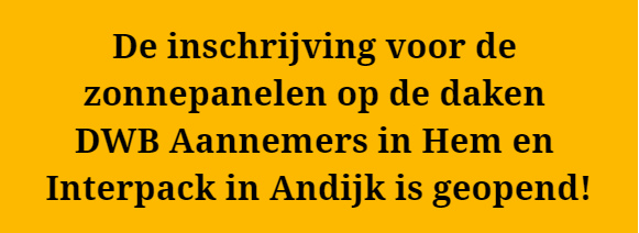 Filed under: Andijk, Duurzaamheid, Energie, Hem, Interpack | Tagged: De inschrijving voor de zonnepanelen op de daken DWB Aannemers in Hem en Interpack in Andijk is geopend!, Uw zonnepanelen op een dak in Andijk of Hem? |
