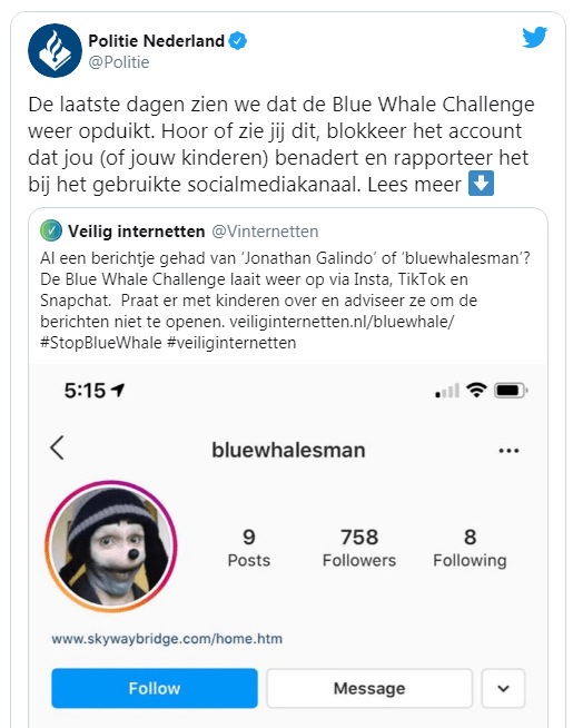 De politie in Hoorn heeft de waarschuwing van de Landelijke Politie op Twitter overgenomen en herhaald over de “Blue Whale Challenge”. Dit levensgevaarlijke ‘spel’ was een aantal jaren geleden al in Nederland actief.