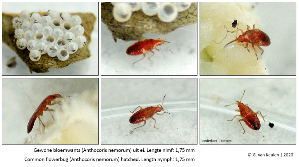 De bloemwants! Net uit het ei gekomen en met een lengte van 1.75 mm nog eentje die in de luiers zit. Het is geen schadelijke diertje, allerminst!