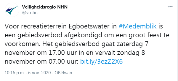 Het is nu verboden om op zaterdag 7 november 2020 vanaf 17.00 uur tot en met zondag 8 november 2020 07.00 uur je te begeven in dit gebied.
