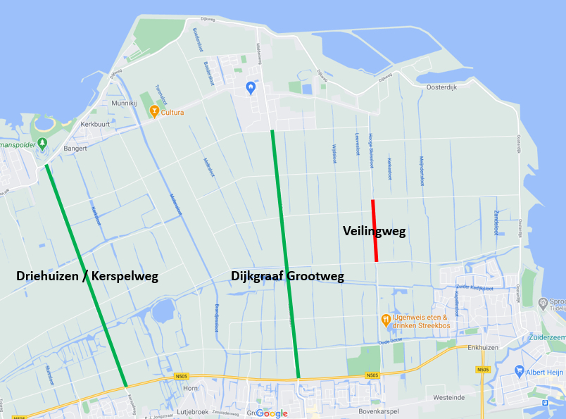 Weggebruikers worden onder de huidige weersomstandigheden aangeraden zoveel als mogelijk hoofdwegen te gebruiken, zoals de Dijkgraaf Grootweg en Driehuizen om aansluiting te krijgen op de N505 Enkhuizen-Hoorn en overige bestemmingen.