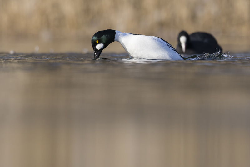 Gefascineerd door een heel laag perspectief, een diepe duik naar het voedsel. Een mooi natuurmoment nog van de winterweek in de Amsterdamse Waterleidingduinen. Al liggend pal naast een half bevroren water was een brilduiker continu in een groot wak aan het duiken naar voedsel; slakjes, vlokreeftjes en kranswieren. Gefascineerd en genietend van het moment en om het duiken in een zo’n laag mogelijk perspectief vast te leggen en met een snelle sluitertijd (1/2500 sec) om de actie te bevriezen. Beelden gemaakt met lifeview met hulp van het klapscherm en de camera liggend op het ijs. De prachtige brilduiker een bijzonder mooie wintereend en vrij talrijke wintergast. Broedend in Scandinavië, de Baltische staten en Rusland waar ze in maart weer naar toe vertrekken.
