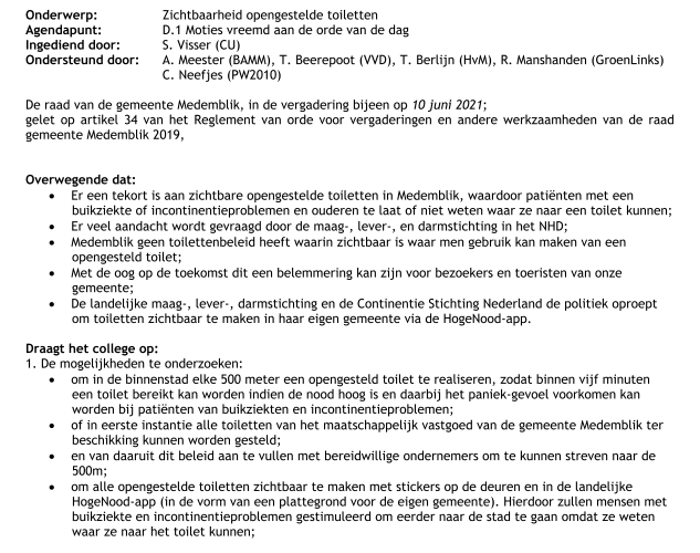 De gemeenteraad stemde gisteren in meerderheid tegen de motie van Silva Visser van de ChristenUnie, waarin zij het college vraagt te onderzoeken of in de binnenstad van de stad Medemblik een opengesteld toilet te realiseren is. Als dat niet mogelijk is om dan in eerste instantie alle toiletten van het maatschappelijk vastgoed van de gemeente Medemblik ter beschikking kunnen worden gesteld en van daaruit dit beleid aan te vullen met bereidwillige ondernemers om te kunnen streven naar de 500 meter.