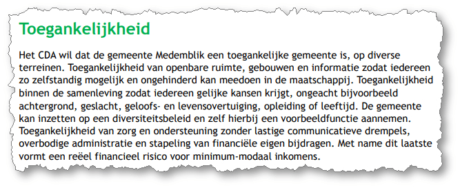 Dat juist het CDA de motie van ChristenUnie wegstemde met 6 stemmen en wat de motie aangaat van D66 en PWF daar verdeeld over stemde (3 voor en 3 tegen) is volgens Van Keulen ook opmerkelijk: “In hun verkiezingsprogramma 2018-2022 staat notabene dat het CDA wil dat de gemeente Medemblik een toegankelijke gemeente is… En toegankelijkheid van openbare ruimte, gebouwen en informatie zodat iedereen zo zelfstandig mogelijk en ongehinderd kan meedoen in de maatschappij. Toegankelijkheid binnen de samenleving zodat iedereen gelijke kansen krijgt en dan tegen deze moties stemmen?”