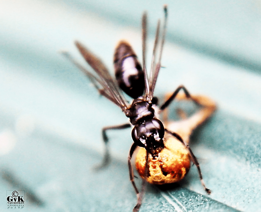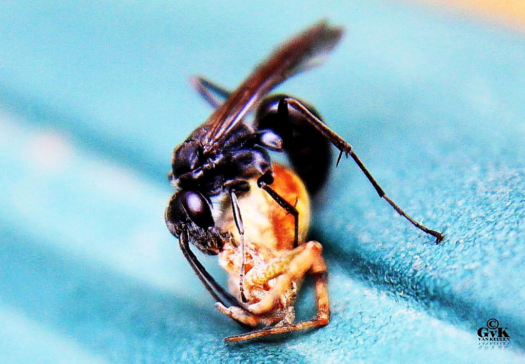 Dit soort wespen heb je in allerlei soorten (Nederland kent 75 soorten). Die vreten kleine spinnen op, terwijl die spinnen weer vliegen en muggen opvreten! Hieronder een andere soort, de Glasvleugelspinnendoder die een kruisspinnetje te grazen neemt. Dit gebeurt op een systematische wijze: de spin wordt verdoofd (door middel van de angel), de meeste poten worden er afgebeten zodat de spin niet kan wegrennen als het te heet wordt onder zijn 8 voeten… en als de spin ‘klaar’ is voor transport dan neemt de spinnendoder ‘m meer naar haar nest (het zijn vrouwtjes die dit doen…). Lees hieronder verder.
