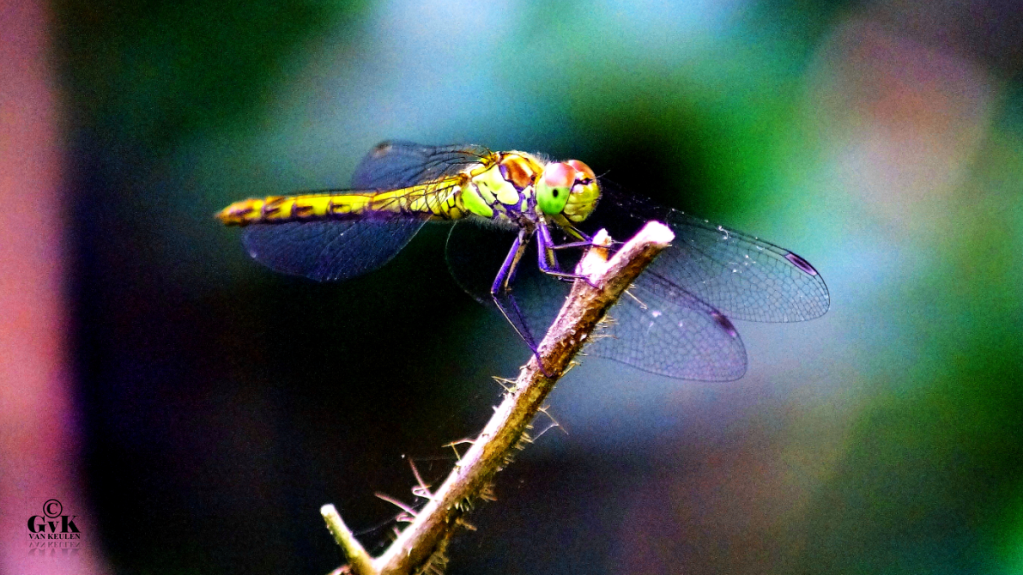 En soms zitten ze gewoon op een stekelig takkie maar waar je niet dicht bij kunt komen vanwege het stekelwerk van de struik… Zonder gekheid zijn het mooie insecten om te zien! Niet dan? Wel toch?