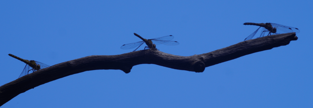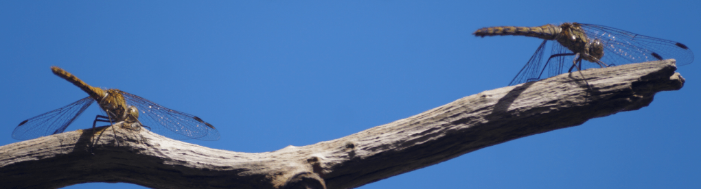 Ja hoor, ze zijn er weer, libellen! Hij glimlacht wanneer hij mij ziet deze roodbruine, of bruinrode heidelibel. In de middag zoeken ze ergens een dorre tak, hoog gelegen om een opwarmpauze te nemen. Het zijn koudbloedige beestjes en moet de warmte ontlenen aan de zonnestralen.