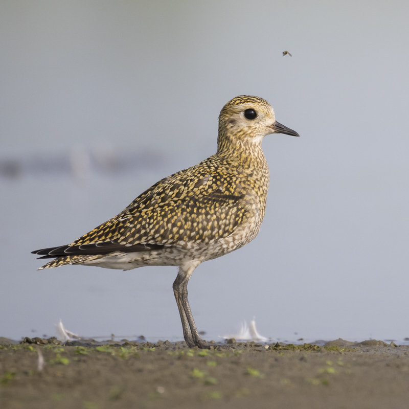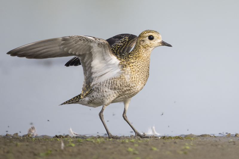 De Goudplevier (25-28cm) in het bijna winterpak, na de broedperiode in de toendra en Arctische regio’s is het volle zwart van de buik (+ hals en wangen) weg wat over zal gaan naar volledig wit. In mooi licht van bijzonder dichtbij een landend exemplaar kunnen vastleggen, prachtige soort en vogelbeleving.