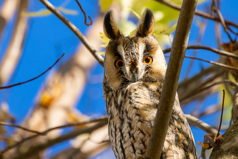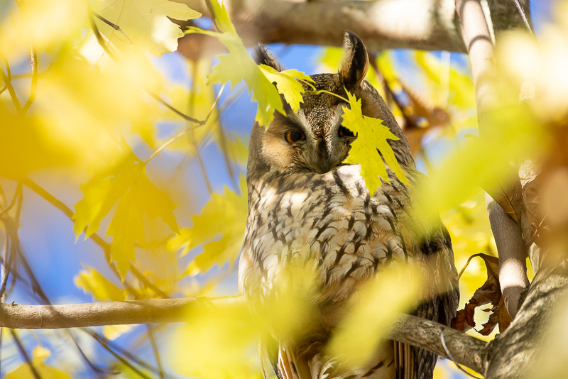 De herfst is de tijd dat de Ransuilen op hun mooist te fotograferen zijn. Bij elkaar komend alla ‘roestend’ in een boom. Tot het laatste blad is gevallen, ze geen beschutting meer hebben en veelal weer vertrekken. Foto’s van Ransuilen in een gekleurde Suikeresdoorn (Acer saccharum) bij Utrecht. Voedsel zoeken ze tijdens de nachten en vliegen ze met zijn allen tijdens de donkere schemer weg, om voor zonsopkomst weer naar hun favo-boom terug te keren. Schitterende vogels met hun grote oranje ogen en grote oorpluimen; die geen functie hebben als oorschelpen, maar over de status (volwassen, sterk, gezond) en over hun stemming vertellen.
