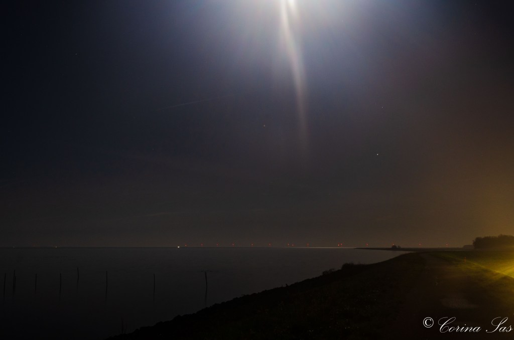 Als ik die 2 nu eens combineer in een foto dan heb je een kerstplaatje anno 2021! Terwijl ik op de dijk sta en foto’s maak van het huis en de kerk, kijk ik over het IJsselmeer. De maan schijnt een lichte vlek op het water. Er zijn een aantal sterren aan de hemel en aan rechterkant van mij is een straatlantaarn die de dijk minimaal verlicht. Het is er echt donker maar je ogen wennen er ook wel weer aan. Ja, zo was het toen er nog geen overdaad aan elektriciteit was. Dit is ook een mooi gezicht!