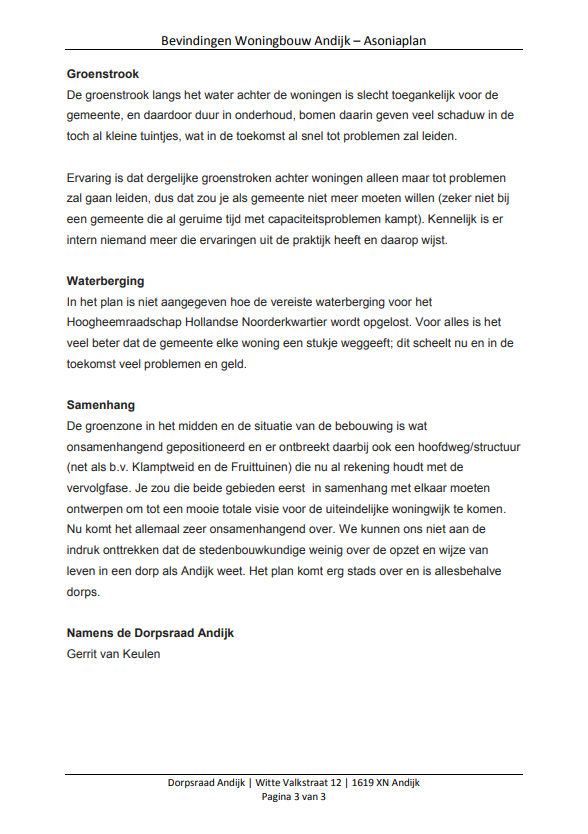 De Dorpsraad Andijk heeft het Asoniaplan, het bouwen van woningen op het voormalige voetbalterrein van Asonia, laten beoordelen door een deskundige. Deze bevindingen zijn inmiddels gedeeld met wethouder Andrea van Langen, die woningbouw in haar portefeuille heeft.