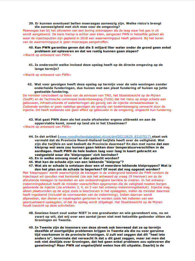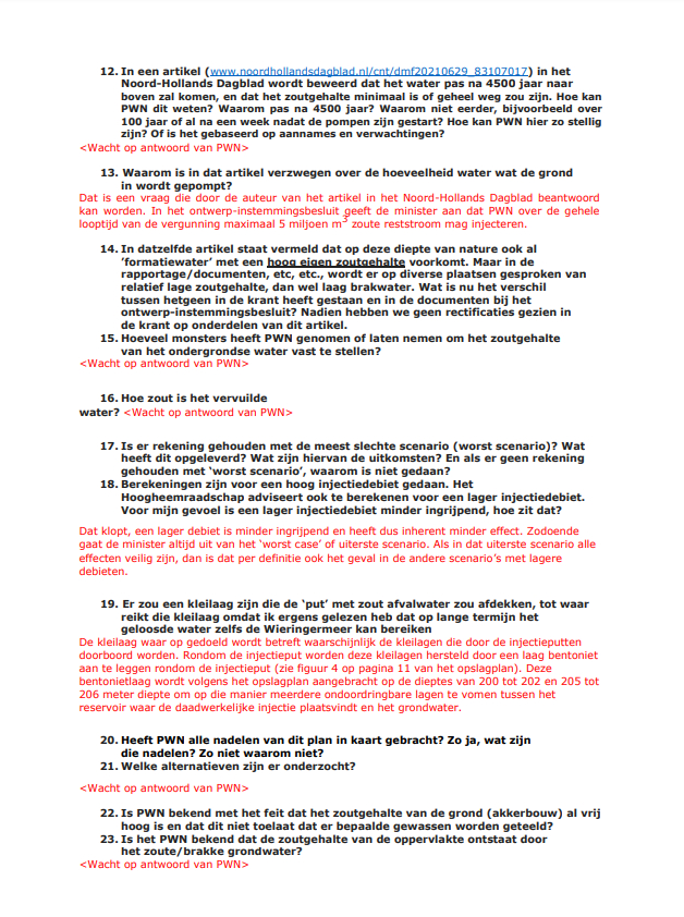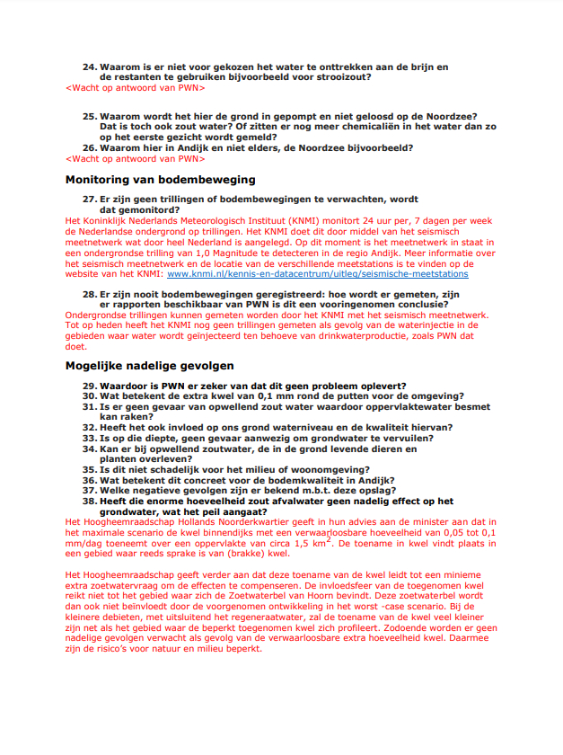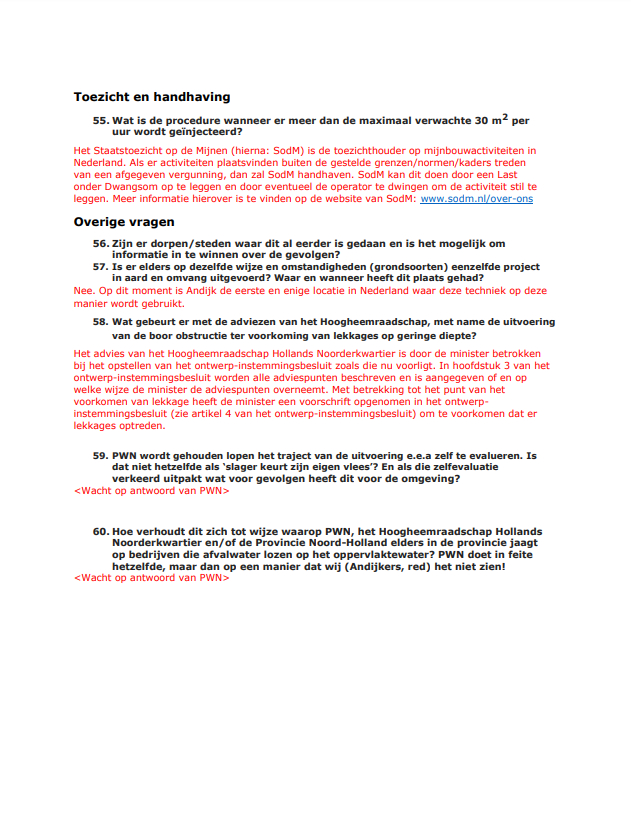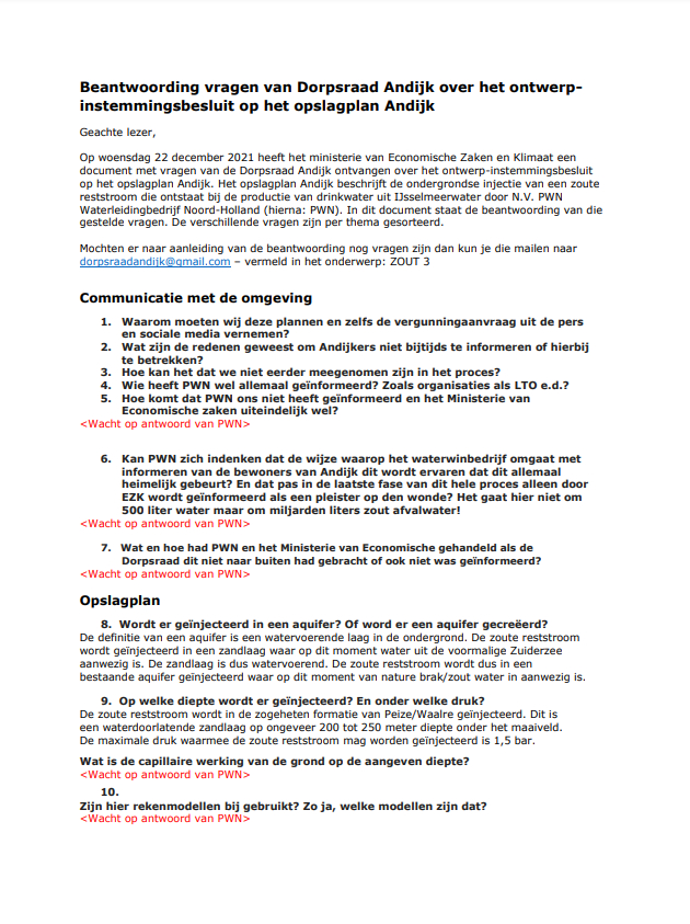 Het Ministerie van Economische zaken heeft de vragen van inwoners van Andijk en de Dorpsraad Andijk beantwoord. Dat laat de dorpsraad weten. Veel van de vragen moeten nog worden beantwoord door PWN, zo geeft het ministerie te kennen. De beantwoording wordt hier integraal weergegeven. De gegeven antwoorden zijn omwille van de leesbaarheid in het rood aangegeven.