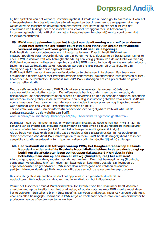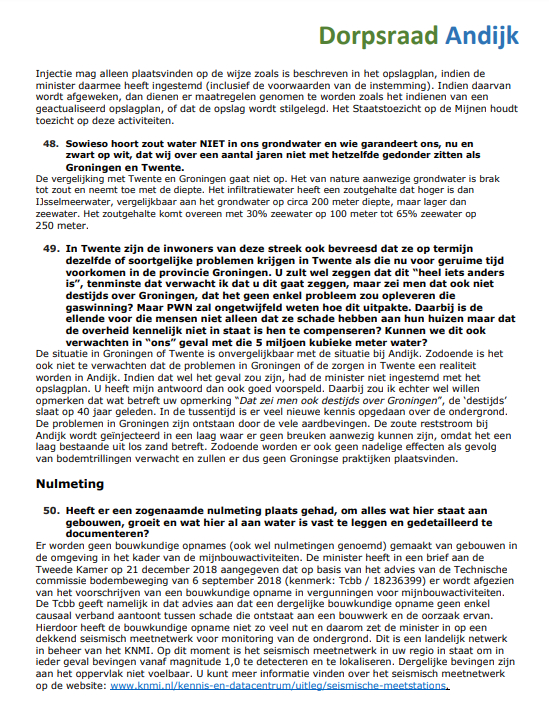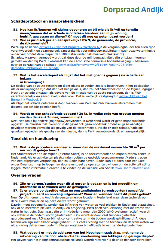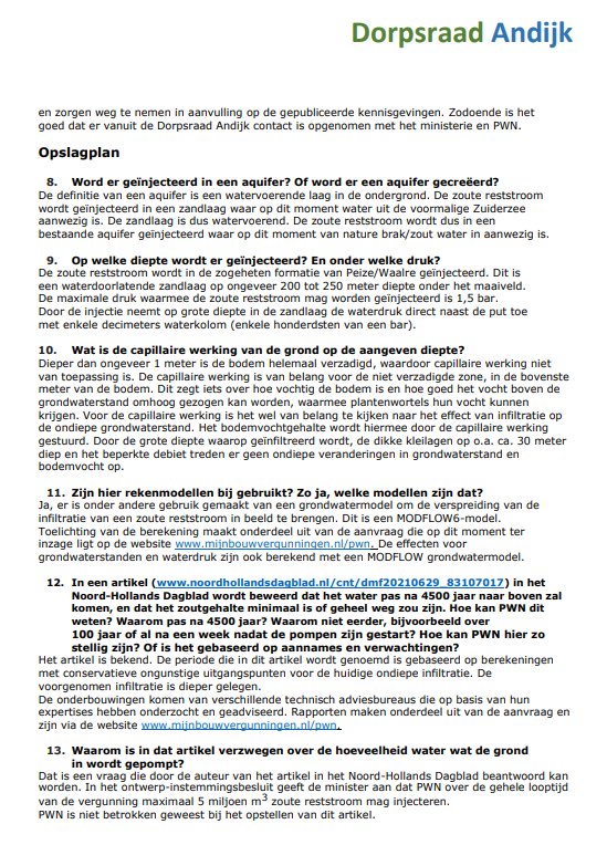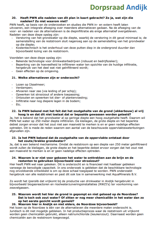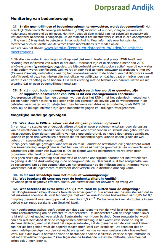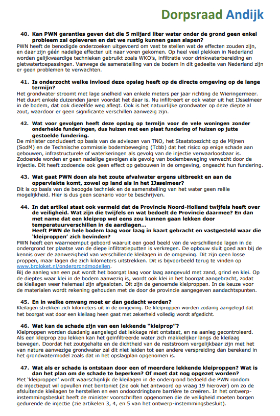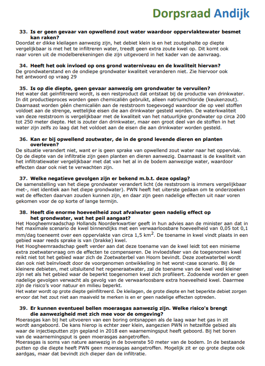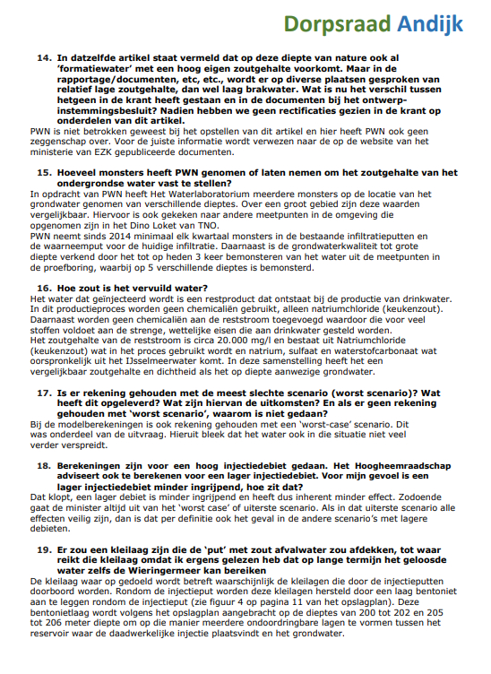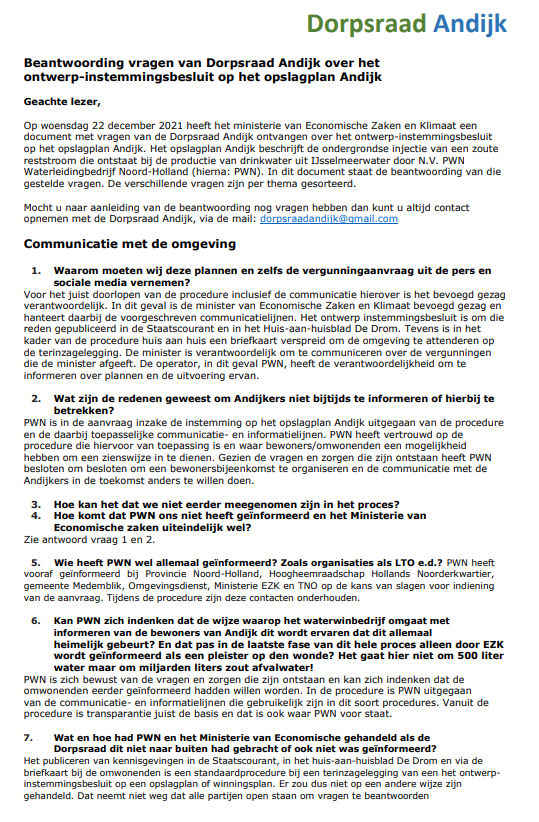 De Dorpsraad Andijk is het Ministerie van Economische zaken en Klimaat en N.V. PWN Waterleidingbedrijf Noord-Holland erkentelijk voor hun welwillende en vlotte medewerking om binnen een korte tijd en gezien de kerstdagen, Oud & Nieuw en de weekeinden de inwoners van Andijk zo snel mogelijk te voorzien van antwoorden op de vragen die zij, naast die van de dorpsraad, hebben ingediend.
