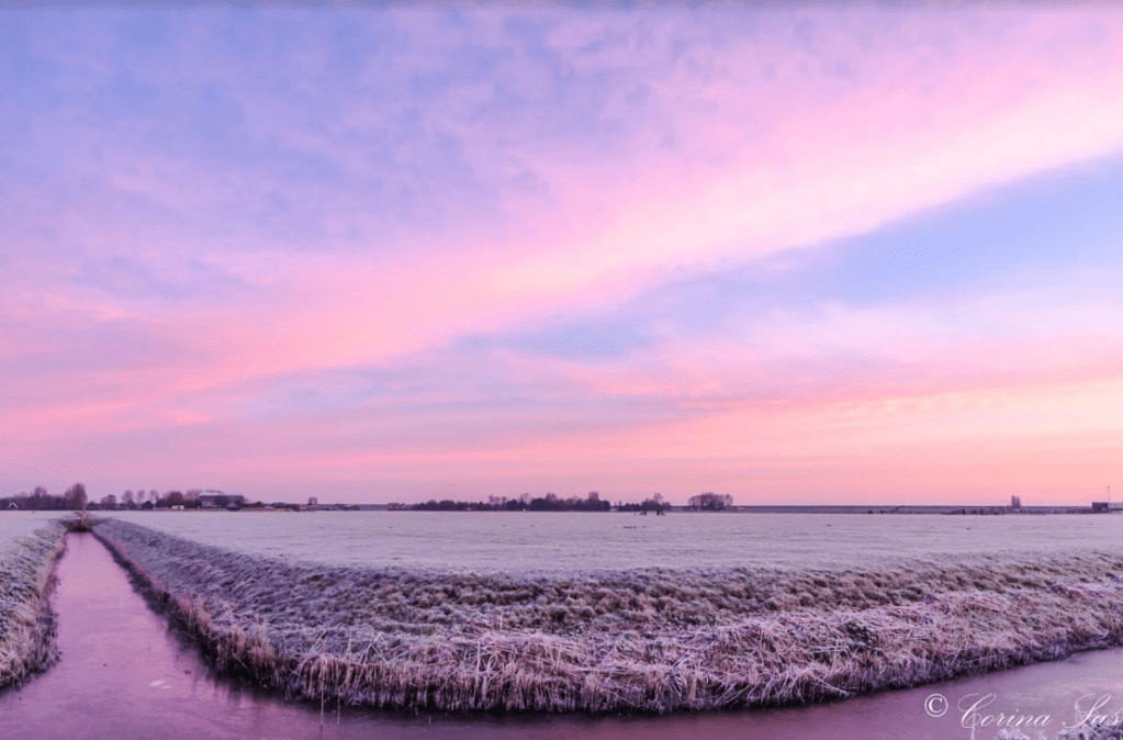 In het verhaal van vorige week had ik geschreven: wat zal de volgende dag brengen? En wat denk je? die dag had het gevroren, het was licht bewolkt en er was een mogelijkheid om de zonsopkomst te zien. Dus ik naar dat mooie stukje polder, Andijk Oost. Dat stukje polder heeft nog een vleugje nostalgie zoals je dat op Texel ziet, vind ik. Boerderijen, hekken, slootjes en een landschap zonder windturbines in de verte. Tenminste als je richting de Oosterdijk kijkt. Ik reed de Rikkert op: Nostalgie ten voeten uit! Een paar boerderijen, een slootje en hoge bomen vormden silhouetten door het licht van de opkomende zon. Dat licht zorgde niet alleen voor een mooi silhouet, ze maakten ook mooie kleuren, door de hoge luchtvochtigheid, in de lucht. Het plaatje maakte de winter op dat moment compleet door de rijp op het grasland en het ijs in het slootje. Toen verder de Rikkert op. Nog een paar plaatjes van schapen, boerenlandhekken en de oranje gekleurde lucht gemaakt. Toen draaide ik me om en zag nog een spektakel in de lucht. Een mooi lijnenspel van kleuren gemaakt door de zonnestralen van de zon wat ik jullie nu ook wil laten zien. Er is een tijdsverschil van ongeveer 10 minuten tussen het maken van deze twee foto’s, je ziet dat het licht en de kleuren veranderen. Ook omdat de zon omhoog klimt waardoor de zonnestralen veranderen van afstand tot het wolkendek. Maar ook, ben ik van standpunt veranderd. Tegen de zon of met de zon in de rug maakt het verschil. Maar ook die paar stappen. Zie het resultaat.