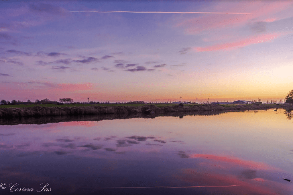Zo lijkt het op deze foto ook: de spiegeling van de lucht in het water, zelfs de vliegtuigstreep zie je. De donkere wal maakt de scheiding. Het is niet helemaal het spiegelbeeld, de zwemmende waterhoentjes in de verte maken een golf die te zien is als een streep op het water. In de verte staan de bomen en de windmolens. Het licht van de ondergaande zon maakt kleuren door reflectie op de wolkjes en wat sluier bewolking.