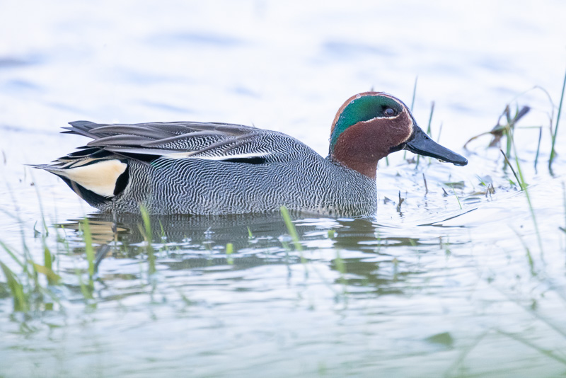 Het kleinste eendje van Europa de Wintertaling (34-38cm) wat is het mannetje een fraaie eend.. In de Kalverpolder bij Wormerveer dient zich soms de mogelijkheid aan dat ze in deze tijd van heel dichtbij te fotograferen zijn. Zittend en met het klapschermpje en op lifeview gefotografeerd.
