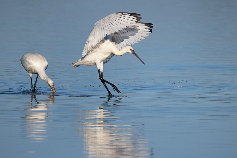De maand augustus is de maand dat veel vogels zich gaan verzamelen na het broedseizoen, zo ook de Lepelaars. Een gebied om er veel bij elkaar te spotten is dan bijvoorbeeld de Oostvaardersplassen. Sommige jongen (2e beeld) krijgen van de oudervogels nog het laatste voedsel via de snaveloverdracht, maar de meeste bedelen nog maar weinig én lepelen al op de typerende manier door het water om hun eigen hachje bij elkaar te sprokkelen. De jongen te herkennen aan de kortere zwart-roze tot donkerroze snavels én de nog zwarte vleugelpunten ipv volledig wit.