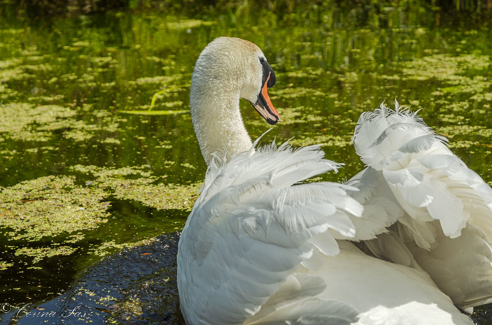 Wij voeren rustig door en lieten vader zwaan zijn gang gaan. Zouden we hem proberen te verjagen, dan kregen we er alleen maar problemen mee. Maar wat kan een zwaan er mooi uitzien als die kwaad is!