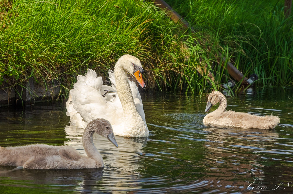 Wat had die zwaan een imponerend gedrag: dan zwom hij aan de linkerkant- dan weer aan de rechterkant van de schuit. En dan die lichaamstaal! Die was duidelijk af te lezen. Onze schipper bleef rustig doorvaren. Toen zagen we aan de linkerkant van de schuit een zwaan met 2 jongen. Dat was het dus: het gevaar wat schuit heette! En dat was goed te begrijpen vanuit de beleving van vader zwaan. Hij beschermde zijn vrouw en kinderen tegen het grote gevaar. Op de foto kijkt moeder zwaan vertederd naar haar kroost en houdt hen goed in de gaten: komt goed hoor!