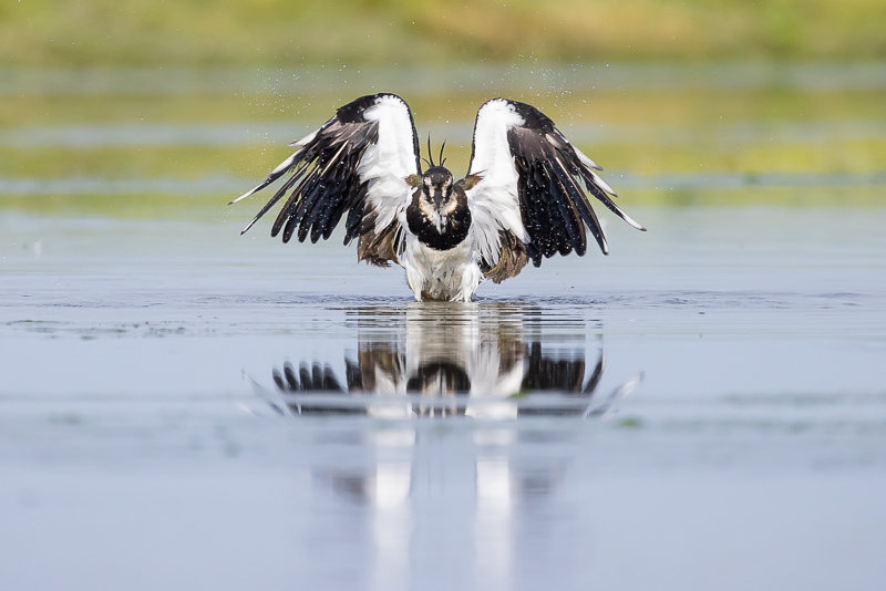 Weinig wind weinig rimpelingen ideaal voor het krijgen van ‘spiegelfoto’s’. Een Kievit die zich in het ondiepe water wast recht voor ons voor de hut. Foto gemaakt op Gruttoland waar veel Kieviten graag een keer rond het middaguur komen om te badderen.