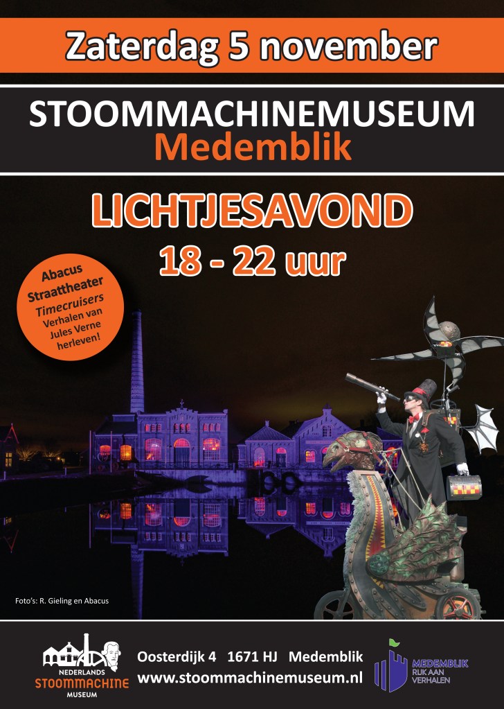 In deze sprookjesachtige sfeer treedt het vermaarde Abacus Straattheater vanavond viermaal op met de duizelingwekkende Timecruisers. De reusachtige fantasiemachines laten de verhalen van Jules Verne tot leven komen. Techniek uit verleden, heden en toekomst komt samen in deze bonte gevaarten met grote wielen, vleugels en straalmotoren. Laat je betoveren door de magie en geniet van improvisatietheater van het hoogste niveau. Leuk voor jong en oud! Tussen de shows door kun je de machines op het museumterrein bezichtigen.