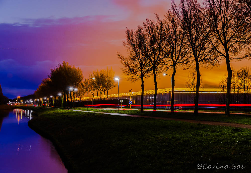 Het gebouw is een kassencomplex waar het licht brandt voor de groei van de planten. Dat licht weerkaatst tegen de wolken. En de lichtjes in de verte is geen groot verlicht plein maar een rotonde. Die lichtjes spiegelen mooi in het water van de sloot. Als je goed kijkt komt er van links ook nog een vliegtuig aan. Op de voorgrond zijn er ook lichtjes op het water: een weerkaatsing van het licht uit de koplampen van …? De zwarte vogel is een vliegtuigje, het is een herdenkingspaal. Hier is een bommenwerper in de Tweede Wereldoorlog neergestort. Er zijn vele van deze herdenkingspalen in het West Friese landschap neergezet om de slachtoffers die voor ons hebben gestreden niet te vergeten: de sporen van de luchtoorlog.