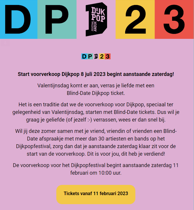 Filed under: Dijkpop | Tagged: Voorverkoop kaarten Dijkpop 2023 start 11 februari |