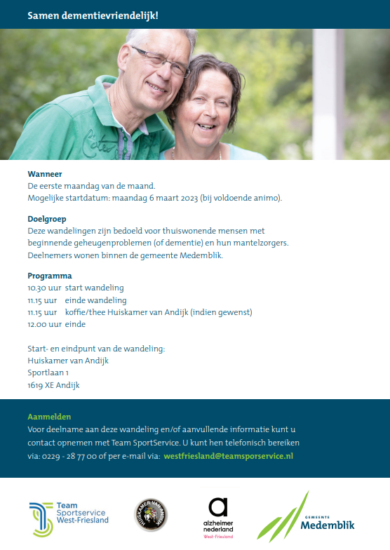 De geheugenwandeling vindt plaats onder begeleiding van een ervaren buurtsportcoach en een deskundige vrijwilliger van Alzheimer West-Friesland. Zie voor verdere informatie (ook voor het opgeven om deel te nemen) de folder.