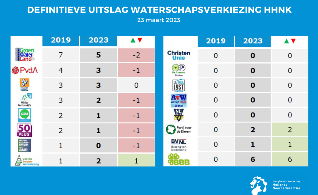De definitieve uitslag van de verkiezing voor een nieuw bestuur van Hoogheemraadschap Hollands Noorderkwartier is bekend. De verkiezingen van 15 maart hadden in het beheergebied van het hoogheemraadschap een opkomstpercentage van 53,2%. In totaal brachten 512.981 Noord-Hollanders hun stem uit.