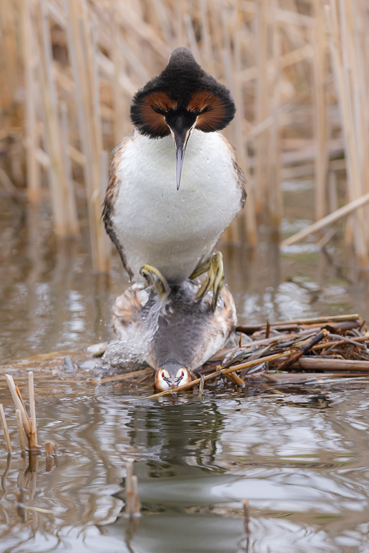 Afgelopen zondag zagen we tijdens de workshop Balts van de Fuut en andere Watervogels verschillende paringen in de haven van Enkhuizen. Kenmerkend en prachtig om te zien zijn bij de paring de uitnodigingen van het vrouwtje aan het mannetje als de boel te lang duurt. Uniek met de kopveren wijd gespreid, rechtopstaand op het hoopje riet en met een trillend lijf en veren het mannetje verleidend. Futen paren in de deze tijd vele malen en over een aantal weken, zo worden pogingen die niet helemaal goed gingen ruim gecompenseerd.:) Het mannetje heeft tijdens de paring zijn kopveren maximaal in ronding uitgezet, 1 van de mooiste vogelkoppen om toch te zien en vast te leggen van onze Hollandse vogels?