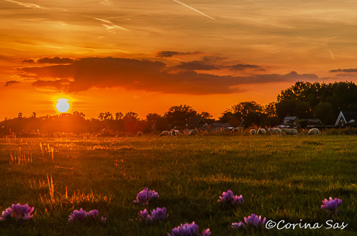 Hier zit ik in het gras achter de lintbebouwing. Schapen nuttigen hun avond maaltijd en doen zich tegoed aan het malse gras. Op de voorgrond bloeien herfsttijlozen, een mooi bolgewas wat bloeit in de herfst. Het is nog een restje van het gehele bollenveld wat daar heeft gelegen.