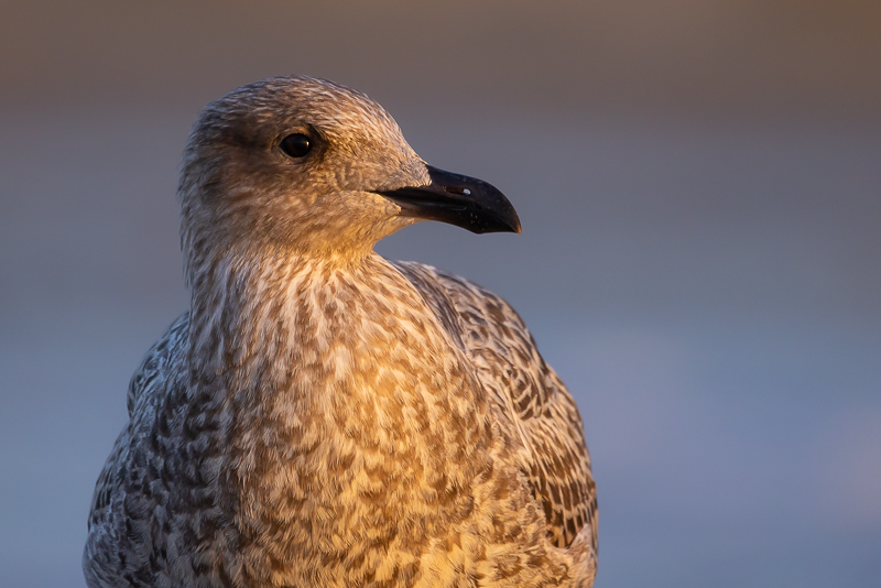 Al fotograferend bij de branding op het strand van IJmuiden vloog deze jonge Zilvermeeuw naar ons toe. Met een nieuwsgierigheid landde hij naast ons en het avondlicht scheen zo even erg mooi op de vogel.