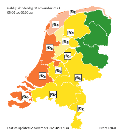 Vanaf het einde van de ochtend staat er voor Zeeland code oranje uit vanwege zeer zware windstoten van 100-110 km/u. De windstoten komen uit een zuidelijke richting. Vanmiddag breiden deze condities zich noordwaarts uit en staat er ook code oranje uit voor de kustgebieden van Zuid-Holland, Noord-Holland en voor het westen van het Waddengebied. Vanavond neemt de wind van het zuiden uit geleidelijk af en geldt er code geel voor windstoten van 80-100 km/u.