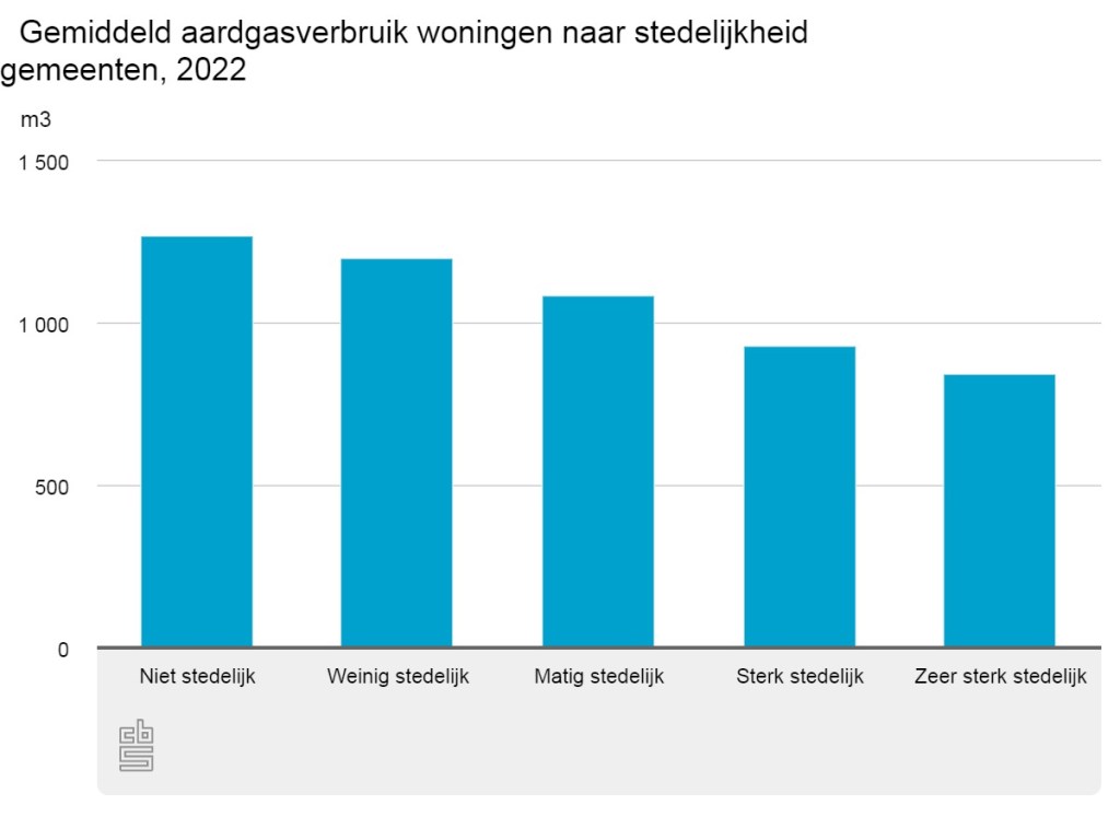 Het gemiddelde aardgasverbruik van particuliere woningen liep in 2022 uiteen van 380 kubieke meter in Almere tot 1 760 kubieke meter in Rozendaal (Gelderland). Gemeenten met een laag aardgasverbruik liggen vaak in gebieden met een uitgebreid stadsverwarmingsnet, zoals Almere, Purmerend en Nieuwegein. Verder geldt over het algemeen dat het gemiddelde aardgasverbruik lager is in stedelijke gemeenten zoals Groningen en Leeuwarden, dan daarbuiten. Zo verbruikten woningen in niet-stedelijke gemeenten anderhalf keer zo veel aardgas als in zeer sterk stedelijke gemeenten.
