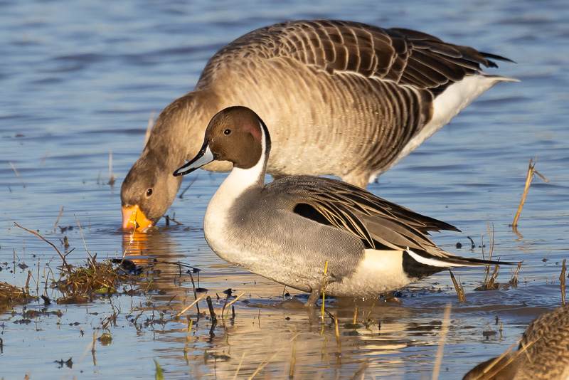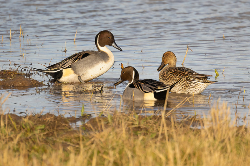 Op de eerste foto één vrouwtje met vier mannetjes, op de tweede foto een Pijlstaart woerd voor een Grauwe gans en is de grootte van de Pijlstaart ook duidelijk te zien. Geen kleine eend en de maat van een Wilde eend. Op het derde beeld twee mannetjes en één vrouwtje. De Pijlstaart is vooral een wintergast en overwinteren hier voor het grootste gedeelte broedvogels uit Finland en Rusland van oktober tot maart.