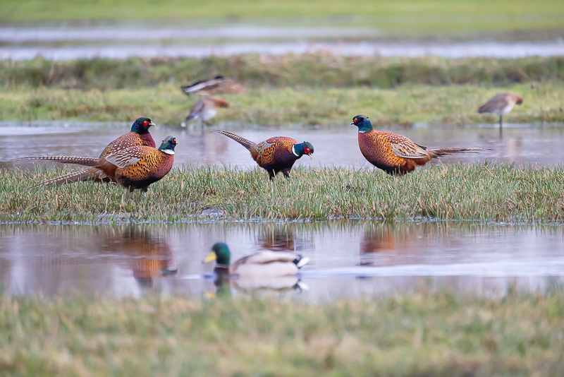 Een prachtig gezicht toen vier hanen zich naar elkaar toe gingen begeven, Grutto’s in de achtergrond en even gewacht tot er ook een Wilde eend voorbij kwam zwemmen voor de foto. Een beeld met zoveel vogels geeft mezelf een gevoel van een schoolplaat van M.A. Koekkoek, die je helaas maar weinig meer ziet.