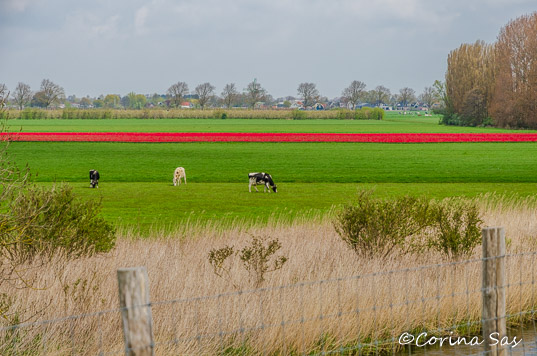 Hier sta ik op de dijk met uitzicht op de polder. Grasland en tulpenvelden wisselen elkaar af. Ik kijk door de lens van mijn camera om een mooie compositie te vinden voor het maken van deze foto. De horizon zoek ik af alsof ik door een verrekijker kijk. Een veld met rode tulpen deelt het grasland in stukken. Met mijn camera draai ik nog een beetje naar rechts.