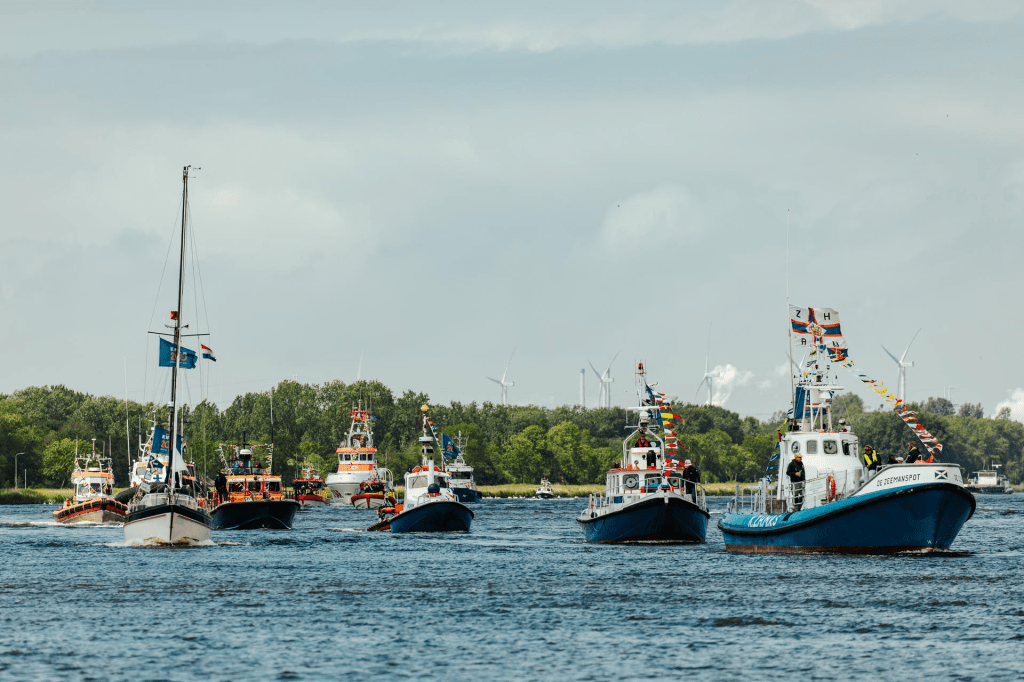 Ode aan 200 jaar KNRM: 30 reddingboten varen met meer dan 100 vrijwilligers van IJmuiden naar Het Scheepvaartmuseum in Amsterdam