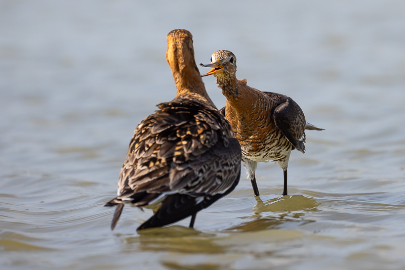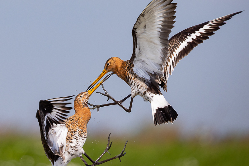 Ook in mei kunnen Grutto’s het nog flink met elkaar aan de stok krijgen. Bij Gruttoland pal voor de hut streden deze twee Grutto’s om hun territorium, wat er pittig aan toe kan gaan. Voor de fotograaf heel speciaal om van zo dichtbij deze schitterende vogels te zien en dit gedrag vast te leggen. Onze Nationale vogel, in het Engels de naam Black-tailed Godwit van de zwarte band die ze op hun staart hebben. Die ze dan vooral gespreid en breed laten zien als ze in grote staat van opwinding zijn om te willen paren.