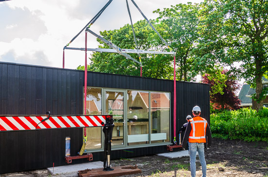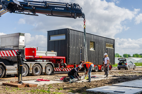 Vanochtend werd de eerste van de circa 30 tiny houses geplaatst aan de Kleingouw in Andijk. Een grote dieplader bracht het eerste exemplaar naar Andijk.