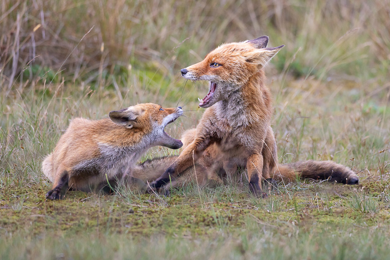 Afgelopen weekend getuige samen met de workshopgroep van deze spelende vosjes in de Amsterdamse Waterleidingduinen. Een moeder (bij de 1e foto boven, op de 2e achter en op de 3e foto rechts) stoeiend met haar inmiddels puberjong geboren eerder dit jaar. Moedervos die haar jong alles leert om straks op eigen houtje een eigen territorium voor zich op te claimen. Een prachtige beleving om van zo dichtbij te zien en om vast te leggen met de camera.