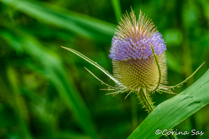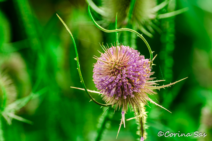 De kaardenbol, een stekelige plant vol met mooie lila/paars gekleurde kleine bloemetjes. Die beginnen met hun bloei, met een ring van bloemen, halverwege het hoofdje en breidt zich uit in twee ringen naar boven en onderen.